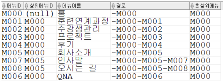 - '상위메뉴ID'가 현재 행(루트)의 '메뉴ID'가 같은 것들은 자식으로 연결 = '상위메뉴ID'가 'M000'인 행들은 아래에 붙여라