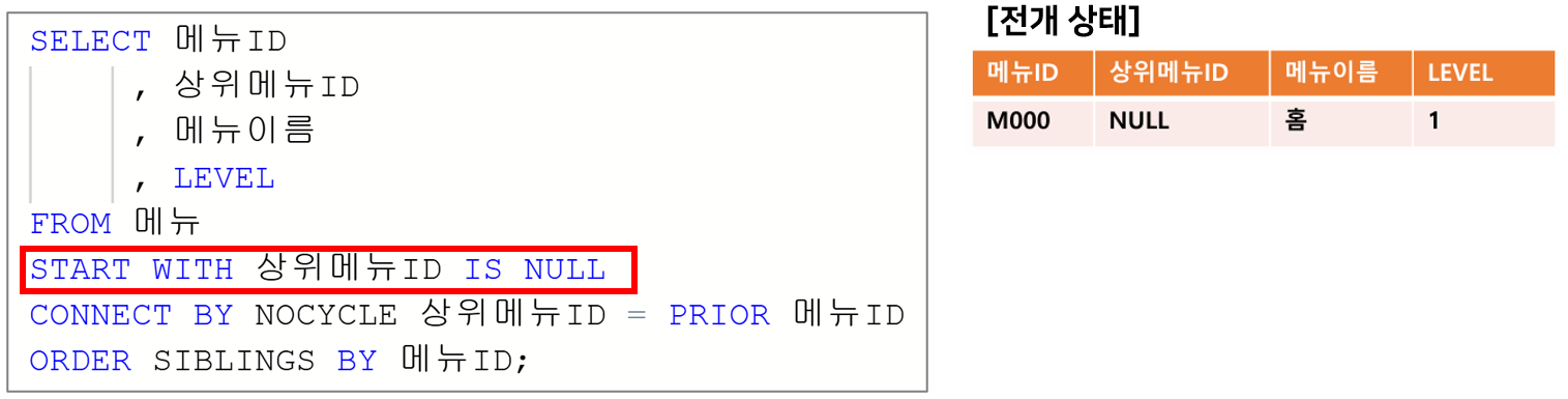- START WITH : 계층을 전개할 시작 위치(=루트)를 지정 (ex. '홈' 메뉴를 시작으로 계층 전개 시작)