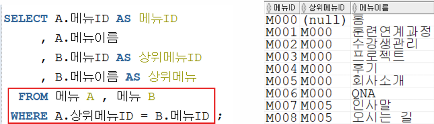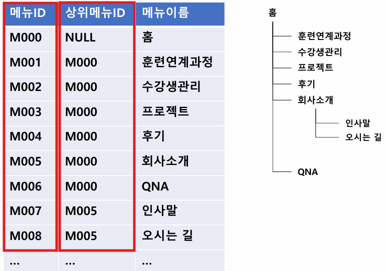 - 한 테이블 내에 계층 관계가 있는 컬럼이 존재할 때 이를 표현하기 위한 쿼리