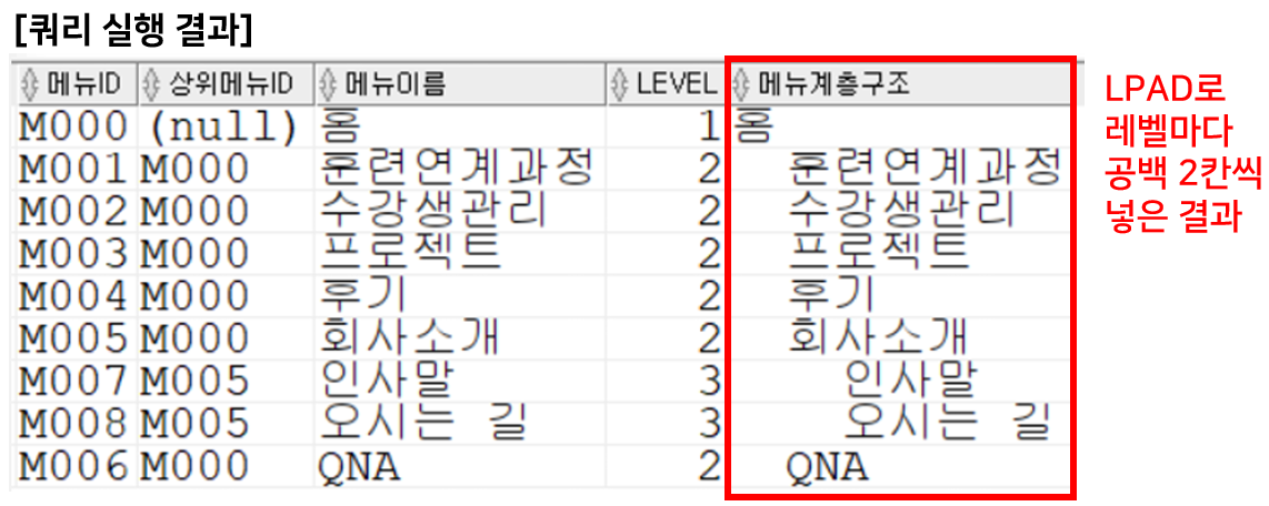 , LPAD(' ', (LEVEL-1)*2 ) || 메뉴이름 -- (보기 좋게 출력하는 부분 추가)